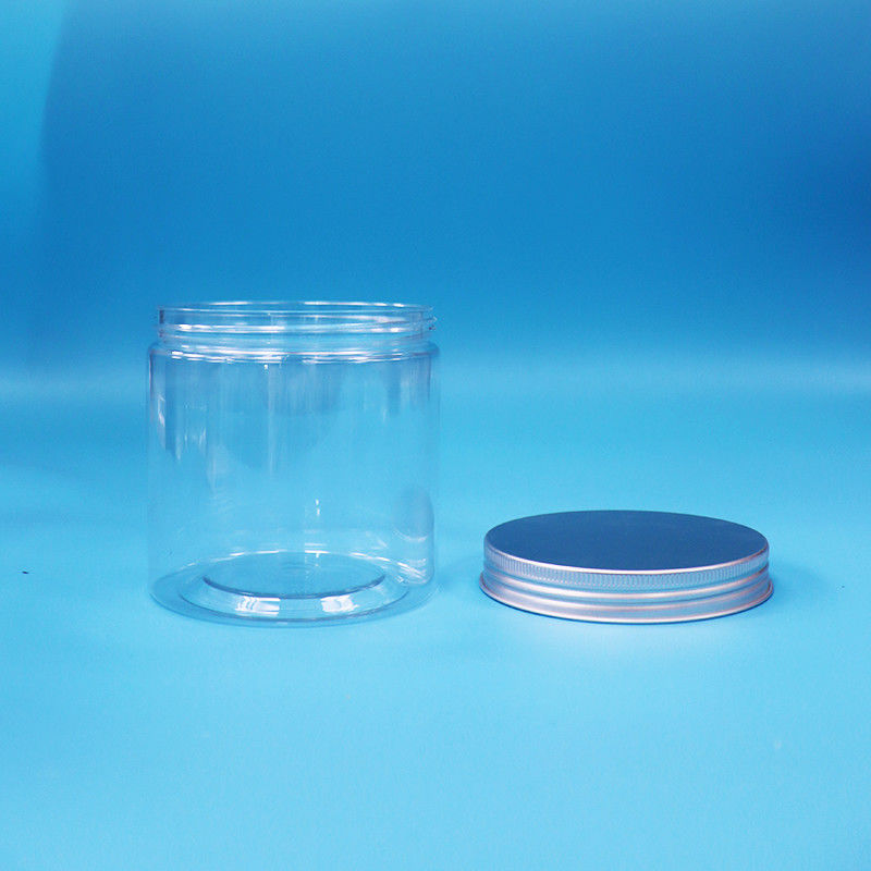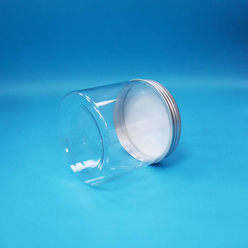 Bentuk silinder mulut lebar bulat bening PET plastik permen makanan cookie jar Aluminium Cap